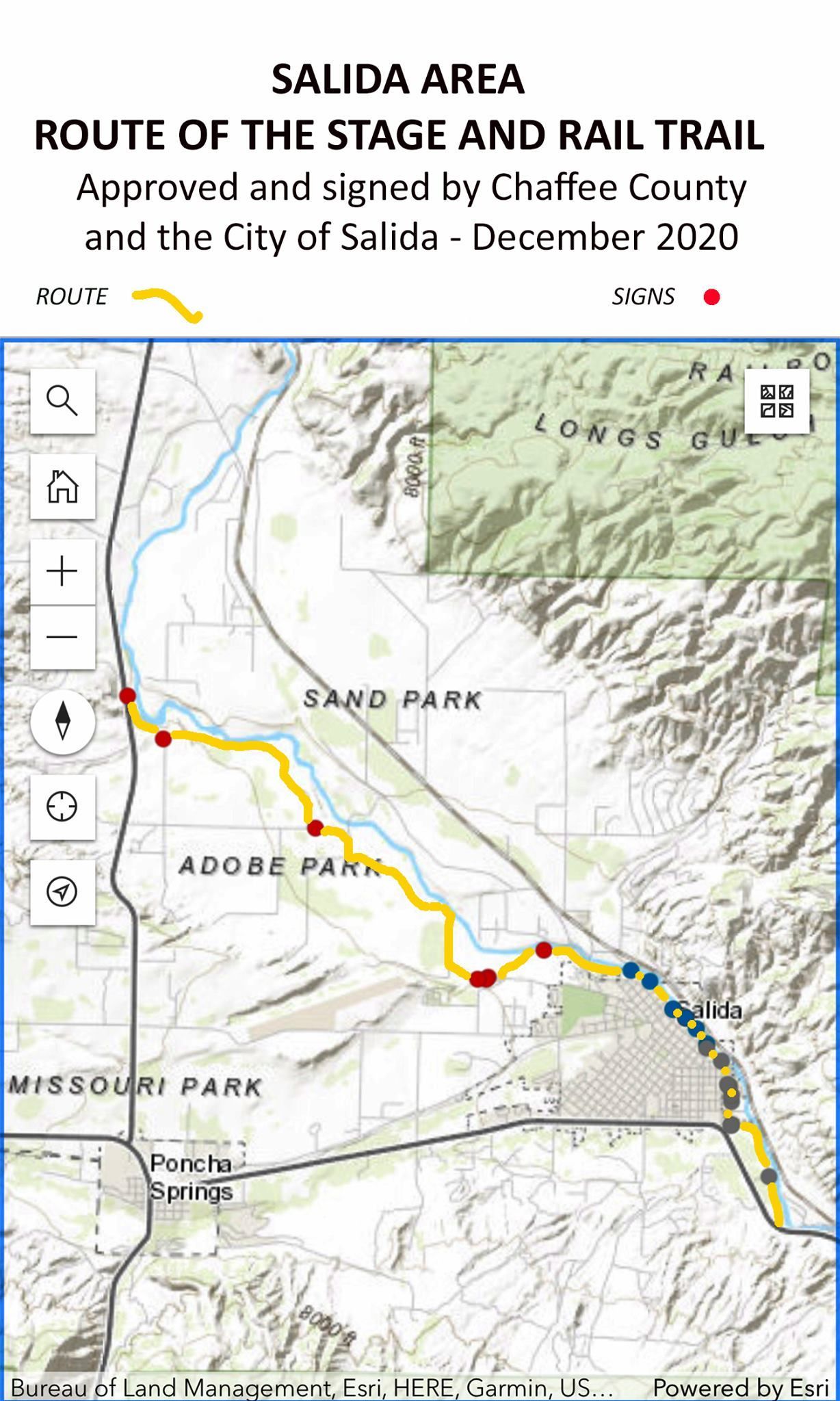 At its southern end, the City of Salida and Chaffee County approved a nine-mile section on country roads, city streets and city trails from US50 north through Salida and west to join US285. Rhe multiuse trail generally follows the historic route of the old stage road from where it crossed the Arkansas near Cleora, through town and west along the south side of the river out to Big Bend.